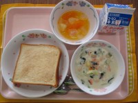 オリパラ給食~カナダ~メープルトーストサーモンのクリームスープ煮フルーツポンチ牛...