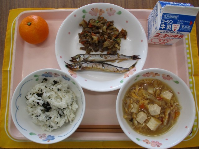 わかめごはんししゃものみりん焼き五目きんぴらかきたま汁みかん牛乳 わかめごはんは...