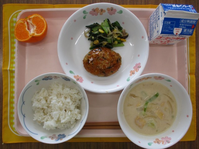 【東京都産の食材を使用した献立】ごはんつくね焼き小松菜の炒め物豆乳みそ汁ポンカン...