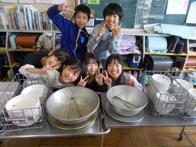 給食係の皆さんです。今日の給食が完食できたことを喜んでいました。