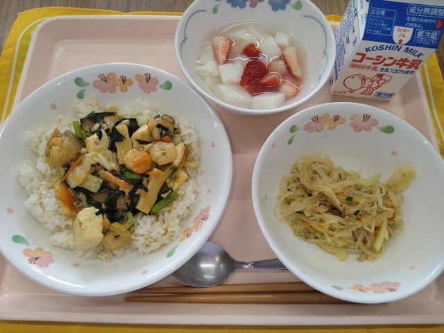 豆腐とえびのうま煮丼牛乳中華サラダいちご杏仁