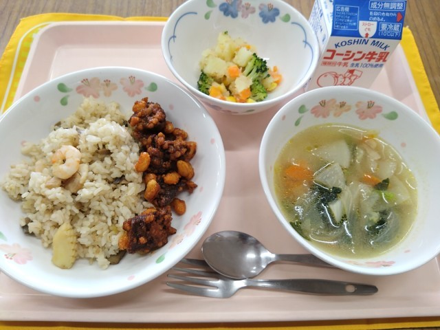 シーフードピラフ牛乳レバーと大豆のマリアナソースポテトとブロッコリーのセサミサラ...