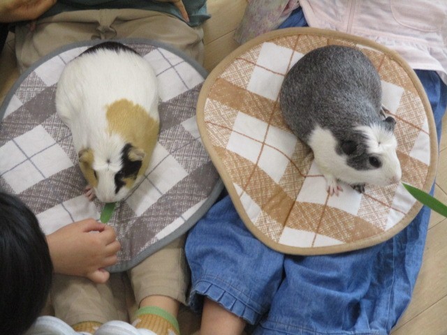 生活科の授業でモルモットと触れ合う出前授業がありました。緊張している子も中にはいましたが、最後には慣れてきて膝の上に乗せてエサをあげました。