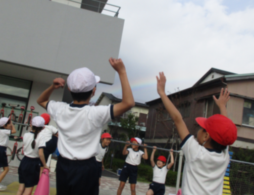 虹をバックに鉄棒の技に挑戦する子どもたちです。