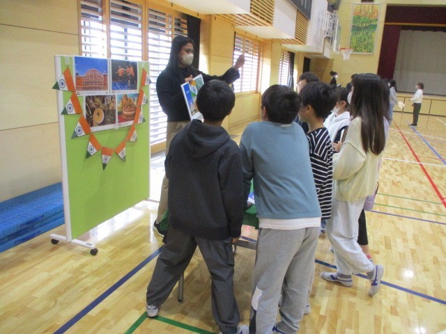 イングリッシュキャラバンを経験しました。いろいろな国の先生方がきてくれました。写真や絵を見ながら英語で質問に答えて、楽しくコミュニケーションをとっていました。