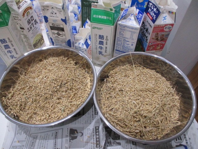 稲の脱穀ともみすりを行いました。脱穀は牛乳パックを使った方法で脱穀をしました。もみすりはすり鉢に入れてボールですり上げて米からもみを外していきます。稲からお米へ変わっていく様子がよくわかったと思います。子どもたちにとって、貴重な経験になりました。
