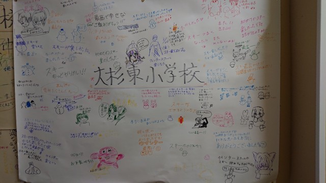 宿舎の渡り廊下に寄せ書きをしました。「スキー楽しい!」「ご飯がおいしい!」「また...