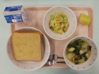 3月5日の献立は、・はちみつレモントースト・キャベツとベーコンのサラダ・マカロニ...
