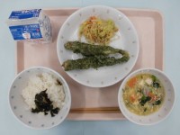 3月2日の献立は、・ごはん・いかフライ・小松菜の甘酢和え・じゃがいものみそ汁・デ...