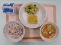 3月12日の献立は、・梅ごはん・五目卵焼き・ハムともやしのからし和え・けんちん汁...