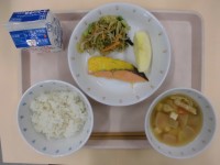 4月27日の献立は、・ごはん・牛乳・鮭のあけぼの焼き・キャベツと人参のおかか和え...