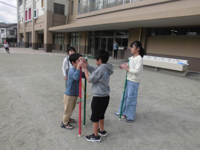 校庭や教室、ホールでの遊びが5年生が考え、2年生に楽しんでもらえるように工夫しました!