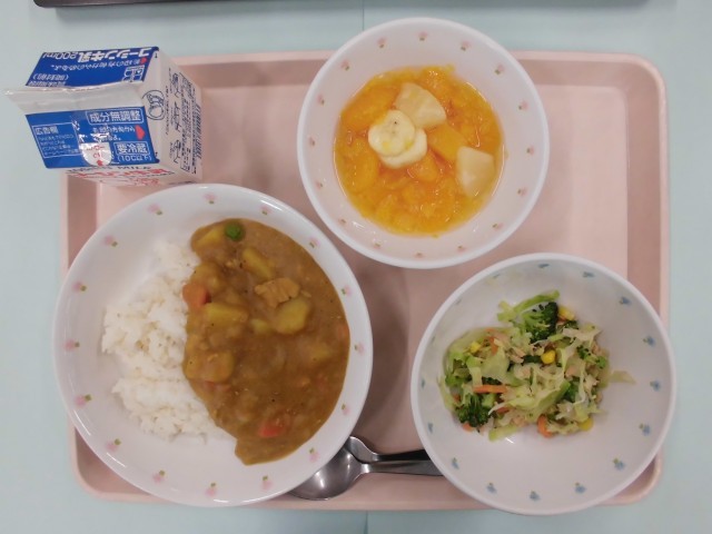今日のカレーの「じゃがいも」「人参」「たまねぎ」とフルーツポンチの「バナナ」は