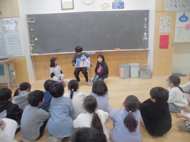 12月15日(火)読書科の学習で2年生へ読み聞かせを行いました。これまでに本選びだけでなく、楽しんでもらえる読み聞かせの方法(アニマシオン)を話し合いで決め、練習を重ねてきました。2年生に楽しんでもらえてとてもうれしい様子が見られました!