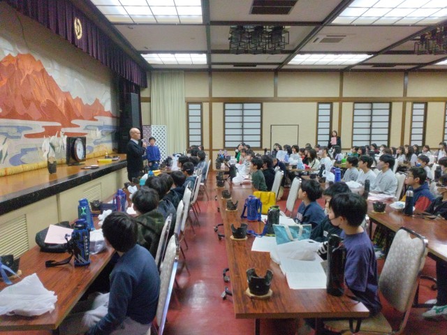 ゆのたに荘に着きました。開校式をして、昼食をとります。予定より30分遅れです。極めて順調です。