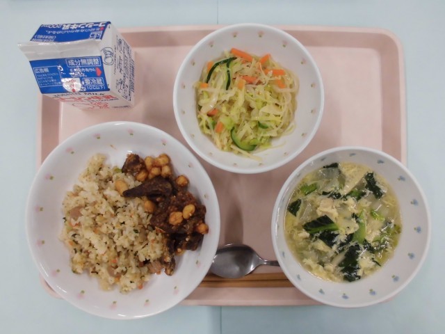 今日の給食は「煮豚チャーハン」です。