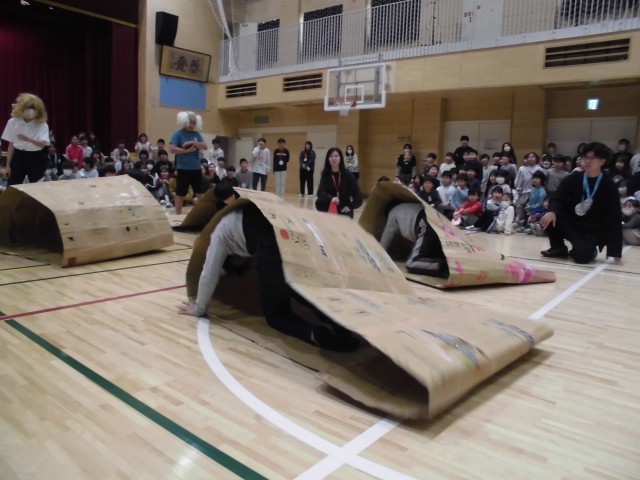 5年生は、6年生と「キャタピラリレー」で勝負しました。