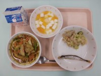 11月6日の献立は、・カレーうどん・焼きししゃも・豚肉ともやしのマヨ和え・フルー...