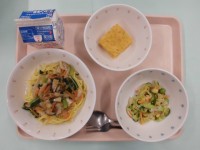 11月12日の献立は、・ベーコンときのこのスパゲッティ・ツナオムレツ・豆まめサラ...