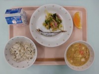 2月4日の献立は、・わかめごはん・焼きししゃも・小松菜のからし和え・かきたまみそ...