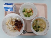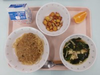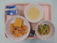 2月12日の献立は、・チキンライス・チーズ入りポテトオムレツ・カリカリ大豆と海藻...