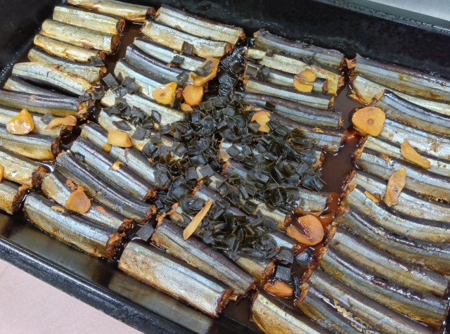 秋刀魚の松前煮は、筒切りにした秋刀魚を、昆布・しょうが・にんにく・しょうゆ・酢・さとうなどで煮ました。1時間以上、じっくり煮ることで骨までやわらかく食べることができます。