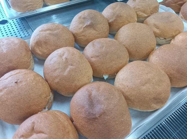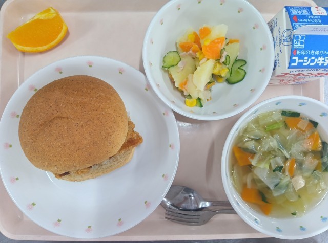 今日の献立は、フィッシュバーガー・ポテトサラダ・キャベツスープ・オレンジ・牛乳でした。