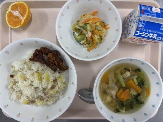 今日の献立は、ハムとさつまいものピラフ・レバーのケチャップソース和え・コールスロー・小松菜とマカロニのスープ・みかん・牛乳でした。
