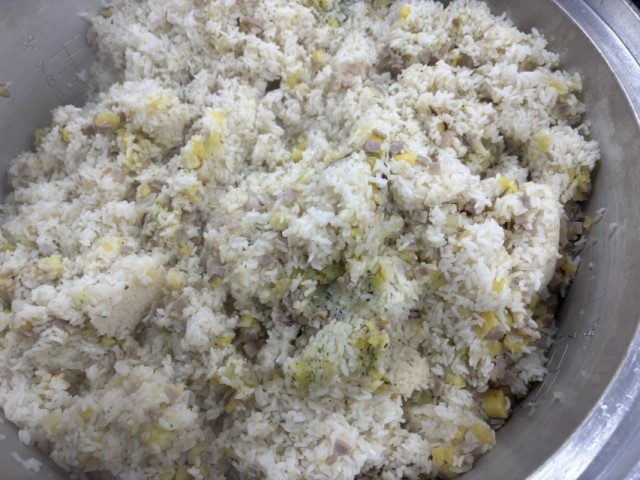 ハムとさつまいものピラフは、さつまいもとハム・玉ねぎを、ごはんと混ぜ合わせました。