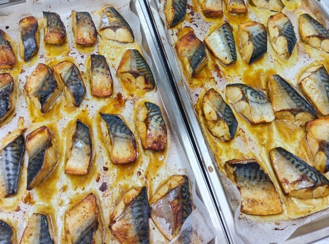 さばは、しょうゆや酒・みりん・カレー粉で味をつけ、オーブンで焼きました。