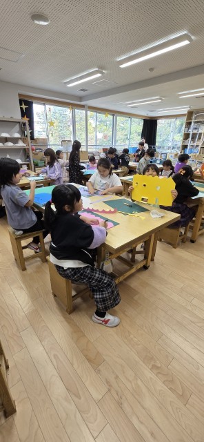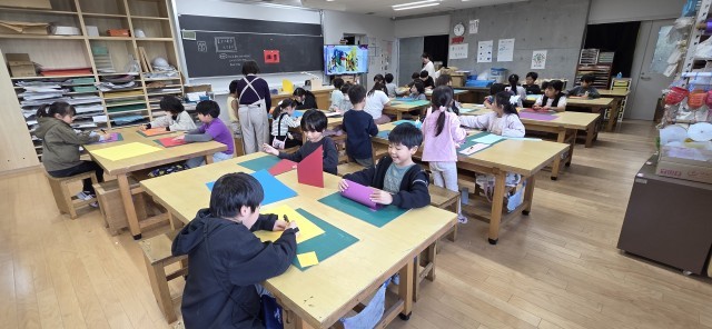 図工では「まどのあるたてもの」をカッターナイフを上手に使いながら、作っていました。まどの形など工夫がたくさん見られました。