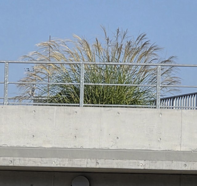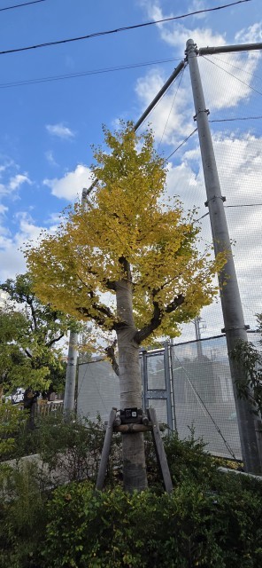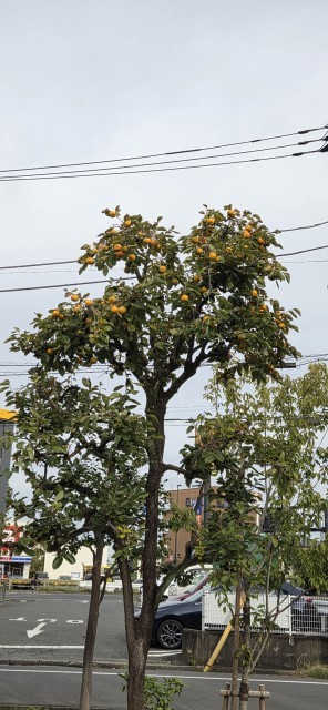 中庭テラスからは、ススキがよく見えます。また、校庭の周りあるイチョウの葉が色づき始め、古川沿いの柿の木には、たくさんの柿が実っています。