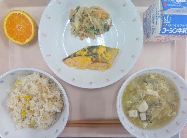 今日の献立は、菊花ごはん・マスのもみじ焼き・小松菜のごま和え・豆腐ともずくのかきたま汁・菊花みかん・牛乳でした。