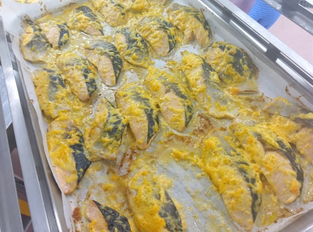 マスのもみじ焼きは、ゆでてすりつぶしたにんじんを、マヨネーズと混ぜ、マスにぬって焼きました。