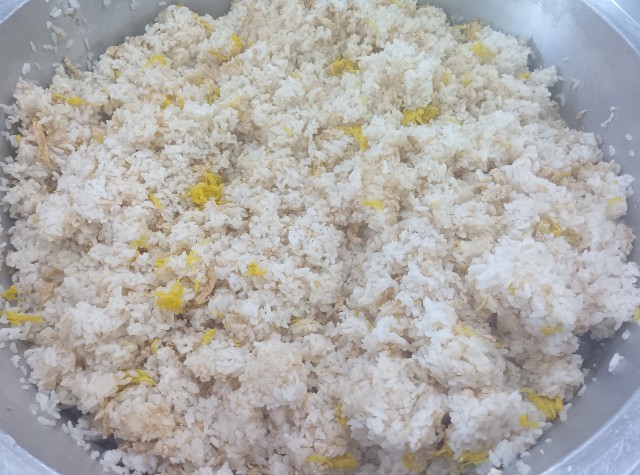 菊花ごはんは、ひき肉と油揚げをしょうゆやさとうで味つけし、菊の花びらと一緒にごはんに混ぜ込みました。