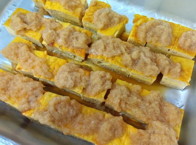 今日の献立は、ごはん・エコふりかけ・卵焼きの大根おろしかけ・白菜ともやしのお浸し・みそけんちん汁・牛乳でした。
