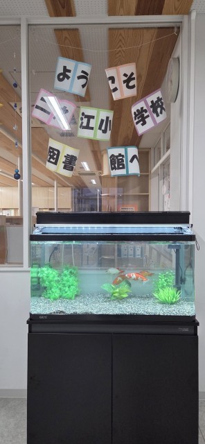 江戸川区の伝統産業係から、水槽一式とワキン4匹を提供していただき、図書室の前に置きました。図書室の中からも見えるようにしてあります。