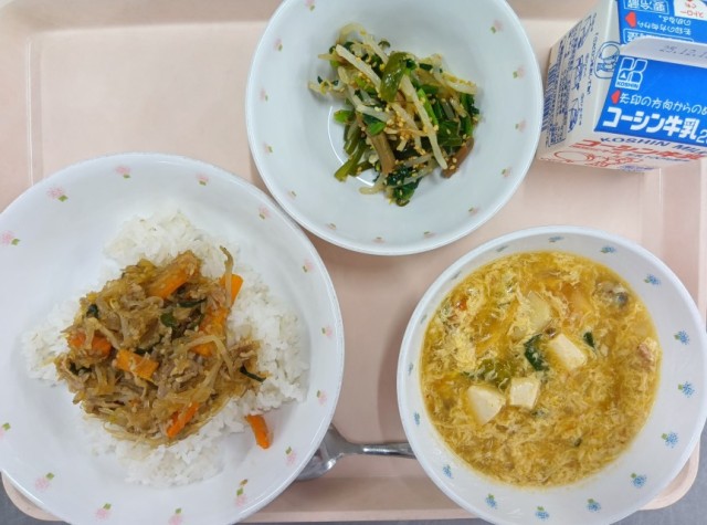 今日の献立は、プルコギ丼・もやしナムル・チゲスープ・牛乳でした。