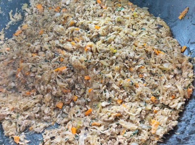プルコギ丼は、ぶた肉・はるさめ・にら・しめじなどを、豆板醤やオイスターソース・しょうゆなどと炒め合わせました。