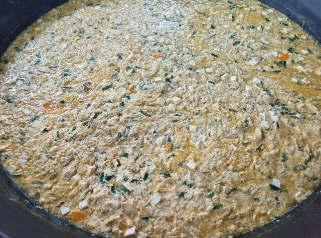 チゲスープは、あさり・豆腐・白菜のキムチ漬け・玉ねぎ・にんじんなどを煮て、たまごでとじました。