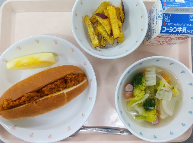今日の献立は、カレーミートチーズドッグ・白菜と大根のスープ煮・さつま芋のごま揚げ・りんご・牛乳でした。