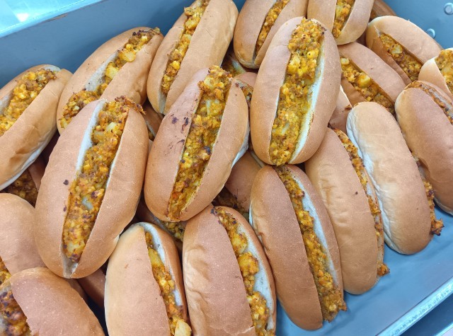カレーミートチーズドッグは、ひき肉・玉ねぎ・にんじん・大豆・じゃが芋を、カレー粉やケチャップ・ソースなどで味付けし、ダイスチーズと一緒にパンにはさんで焼きました。