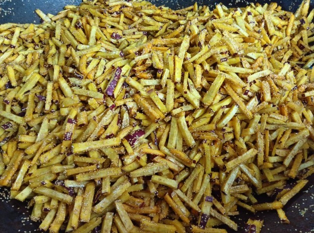 さつま芋のごま揚げは、さつまいもを油で揚げて、さとうで作ったシロップと、ごまをからめました。