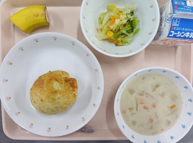 今日の献立は、ベーコン入り小松菜パン・コールスロー・クラムチャウダー・バナナ・牛乳でした。