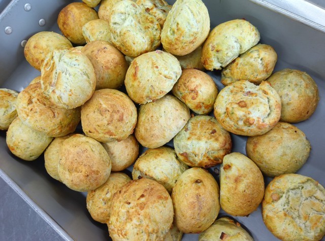 小松菜・ベーコン・玉ねぎ・ダイスチーズ・ごまなどを、パンの生地に混ぜ込みました。