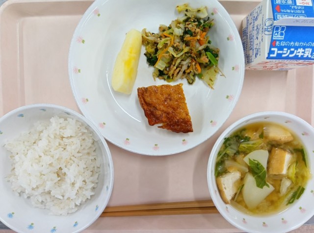 今日の献立は、ごはん・五目たまご焼き・小松菜とツナの磯和え・じゃが芋と厚揚げのみそ汁・りんご・牛乳でした。