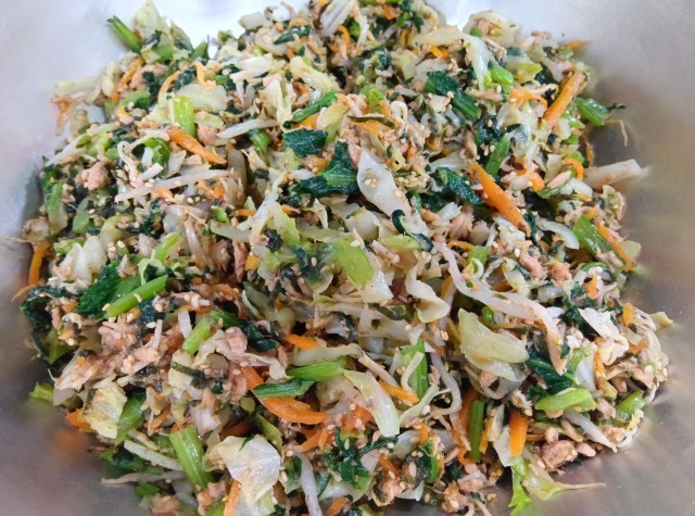 小松菜とツナの磯和えは、小松菜・キャベツなどと、きざみのり・おかか・ごまを和えました。