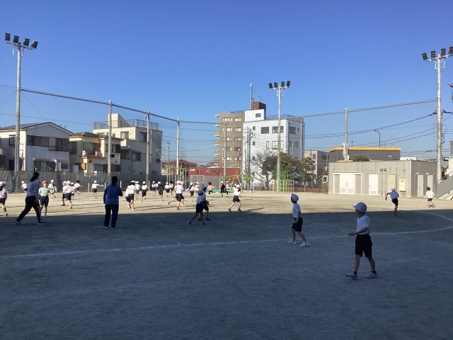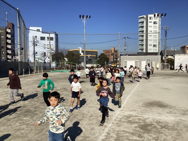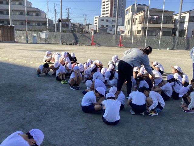 体育の授業では、おに遊びをしました。誰が鬼だかわからないドキドキおにごっこ。友達の動きをよく見て逃げる様子が見られました。