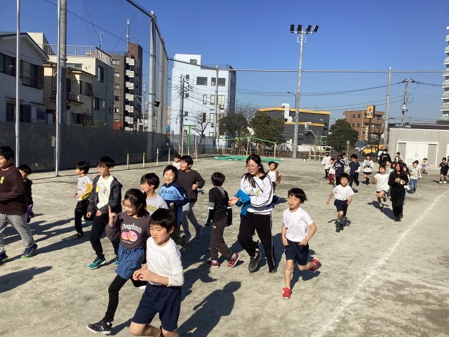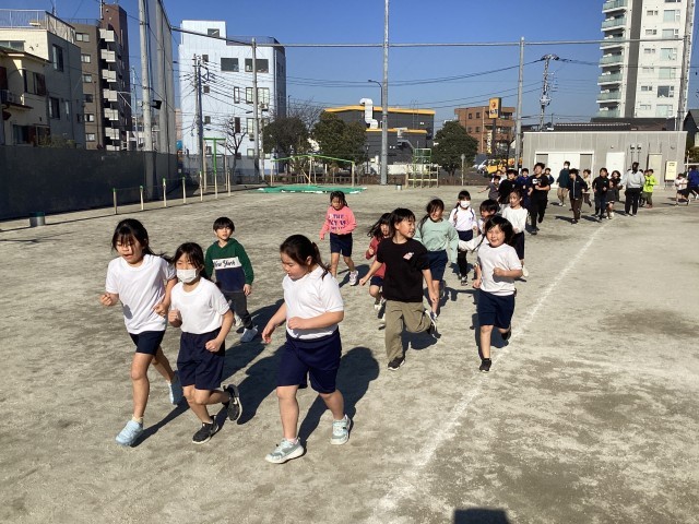 持久走月間で元気に走る2年生。日々、自分の記録を更新できるようにがんばっています。高学年に負けないように走る姿が見られます。