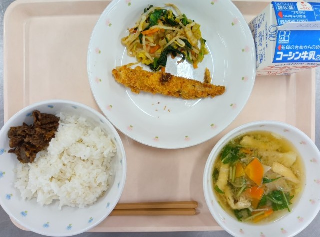 今日の献立は、ごはん・しぐれ煮・ししゃもフライ・白菜と小松菜の和え物・すりごまのみそ汁・牛乳でした。